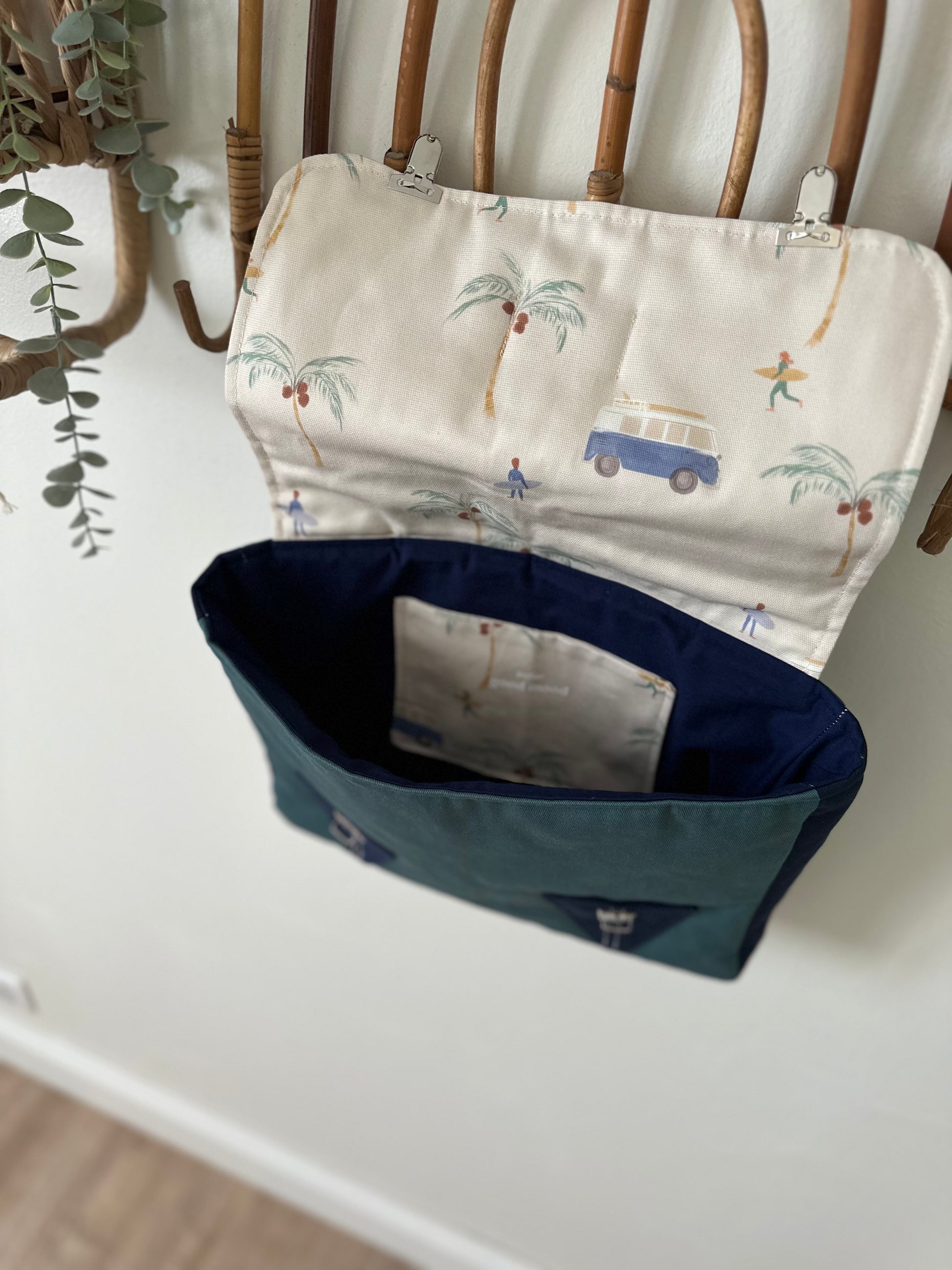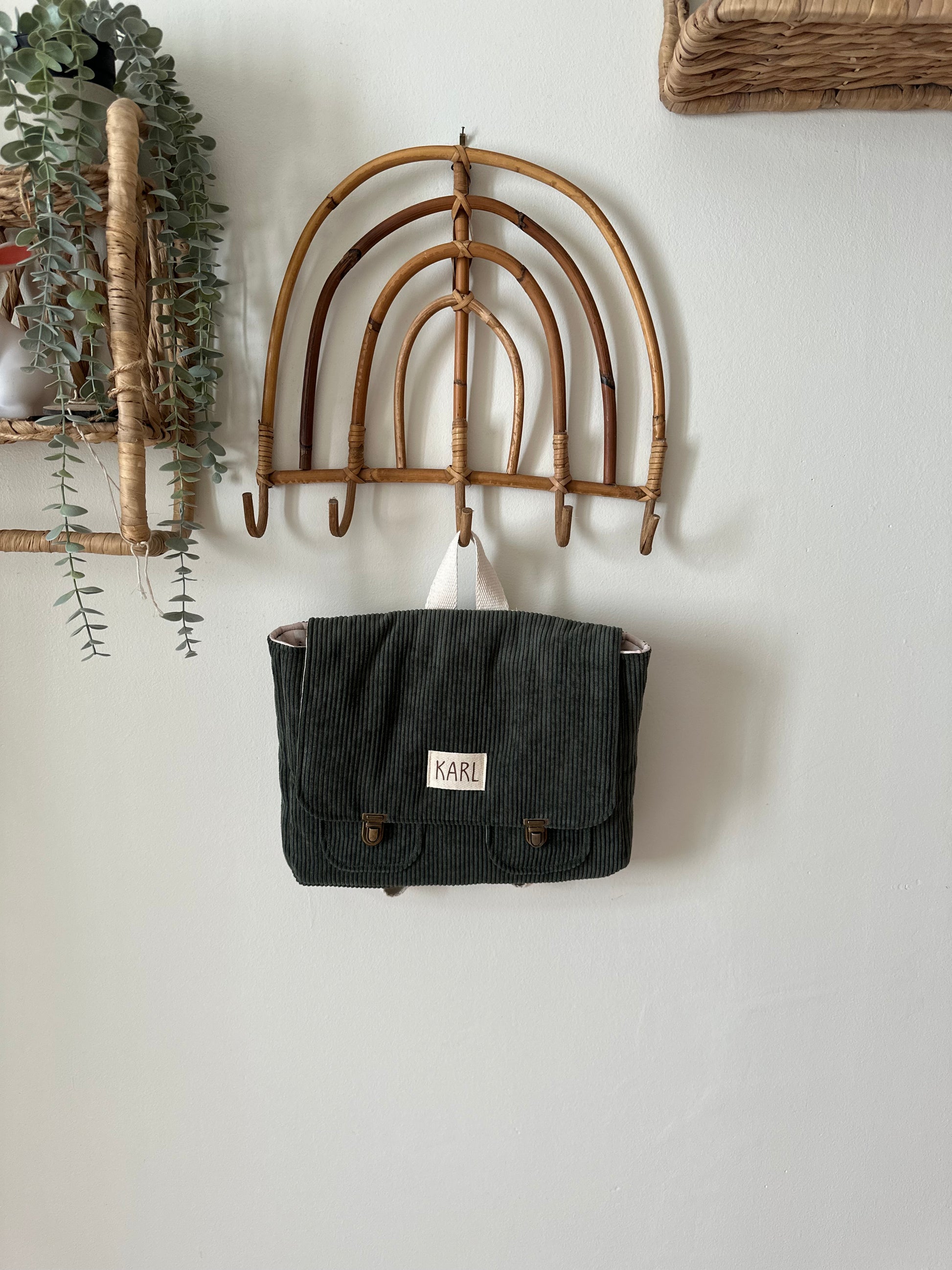 Ce petit cartable a Ă©tĂ© confectionnĂ© Ă la main dans un joli velours cĂŽtelĂ©, et doublĂ© dâun tissu fleuri plein de bonne humeur. Son format (34 x 25 x 5 cm) est idĂ©al pour les trois annĂ©es de maternelle : on y glisse sans souci le carnet de liaison, le doudou, le livre de bibliothĂšque, ainsi que le petit sweat pour les journĂ©es ensoleillĂ©es.