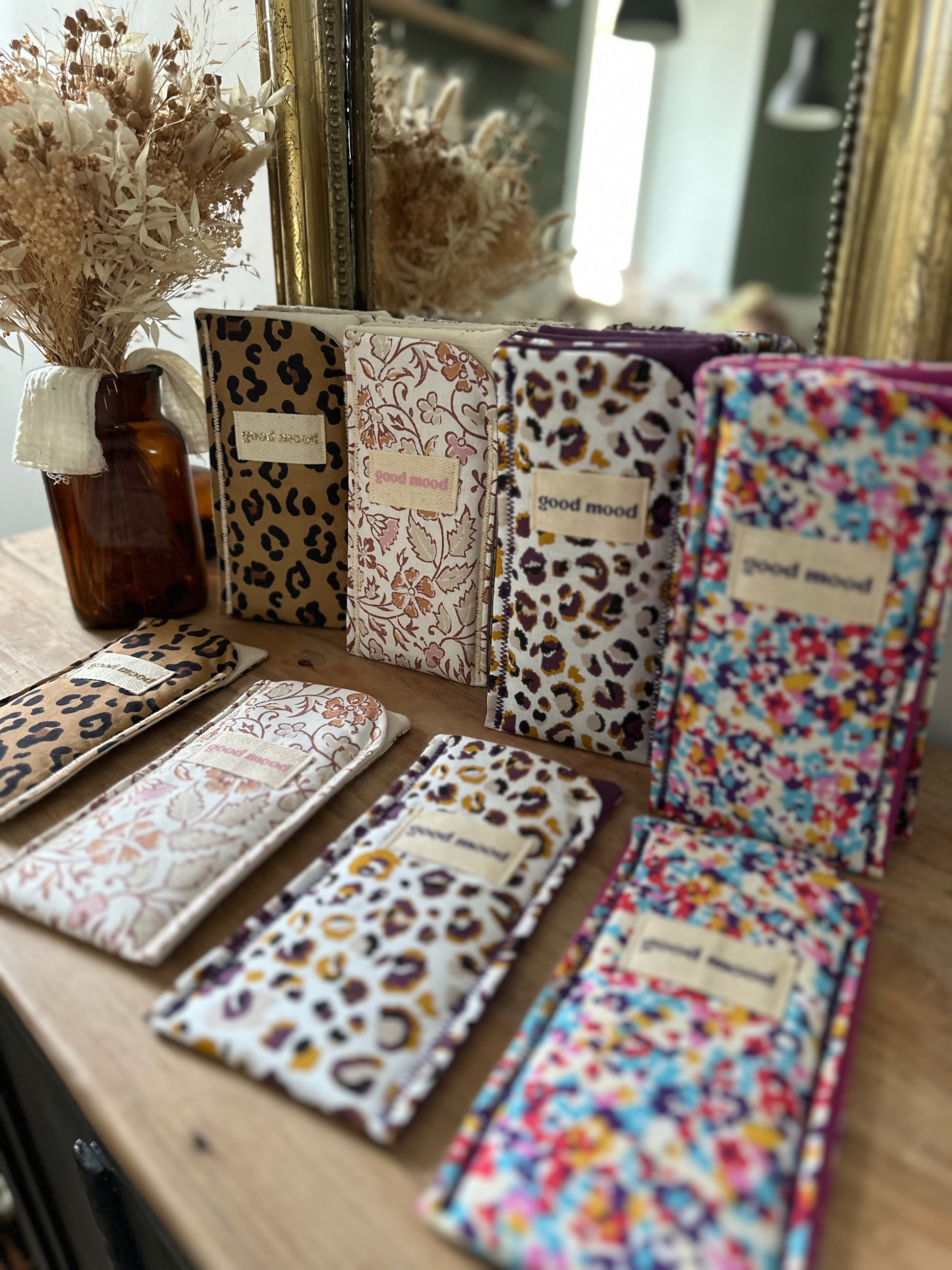 • Design : Tissu à motifs colorés, avec étiquette “Good Mood” cousue (possibilité de personnalisation avec le message de votre choix !)